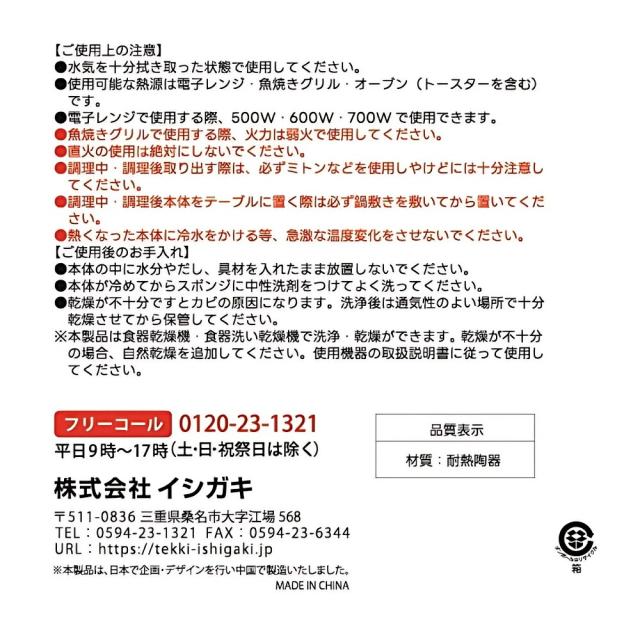 | 商品名: イシガキ産業 DLレンジ陶器プレート 長角 19x11cm 電子レンジ調理器 焼き魚 焼く 遠赤外線 オーブン 魚焼きグリル 食器乾燥機 食器洗い乾燥機 調理器具 -商品説明- レンジ陶器プレート 長角 19x11cm 電子レンジで肉・魚が焼ける 電子レンジでのマイクロ波を受けて発熱する特殊素材を配合。 発熱効果で器が上手に温まり、陶器の遠赤外線効果で美味しく調理できる。 魚を焼く時のポイント1 本体のみを電子レンジに入れて600Wで1分30秒余熱 魚を焼く時のポイント2 食材をのせて600Wで加熱(食材の水分はキッチンペーパーでよく拭き取ってください) 魚以外の料理も 魚以外の料理も作れます。レシピ付き 食器乾燥機・食器洗い乾燥機で洗浄・乾燥ができる -特徴・品質- ・電子レンジで手軽に焼き魚や肉が調理できる発熱素材を配合。 ・陶器の遠赤外線効果で食材をふっくら美味しく仕上げる。 ・電子レンジ・オーブン・魚焼きグリル対応で多用途に活躍。 ・食器洗い乾燥機・食器乾燥機対応でお手入れ簡単。 ・魚以外の料理にも使えるレシピ付き。 -仕様- ・サイズ:(約)幅21×奥行12×高さ3.5cm ・本体重量:(約)0.395kg ・素材:本体/耐熱陶器 ・生産国:中国 ・対応熱源:電子レンジ・オーブン・魚焼きグリル -機能- ・電子レンジで予熱し、焼き目のついた香ばしい仕上がりに。 ・魚焼きグリルやオーブンでも本格調理が可能。 ・お手入れ簡単で、食器洗い乾燥機にも対応。 -使用・手入れについて- ・本製品は、高出力器具(業務用)のレンジには使用出来ません ・水気を十分拭き取った状態で使用してください ・使用可能な熱源は、電子レンジ、魚焼きグリル・オーブン(トースターを含む)です ・電子レンジで使用する際、500W・600W・700Wで使用できる ・魚焼きグリルで使用する際、火力は弱火で使用してください ・直火の使用は絶対にしないでください ・調理中・調理後取り出す際は、必ずミトンなどを使用しやけどなどには十分注意してください ・調理中・調理後本体をテーブルに置く際は必ず鍋敷きを敷いてから置いてください ・熱くなった本体に冷水をかける等、急激な温度変化をさせないでください ご使用後のお手入れ ・本体の中に水分やだし、具材を入れたまま放置しないでください ・本体が冷めてからスポンジに中性洗剤をつけてよく洗ってください ・乾燥が不十分ですとカビの原因になります。洗浄後は通気性のよい場所で十分乾燥させてから保管してください。 -注意事項- ・商品の色はできる限り実物に近づけていますが、ディスプレイ設定や撮影条件により色味が異なる場合があります。ご了承ください。 ・ご注文のタイミングや内容により、購入後のキャンセルや修正が制限される場合があります。 ・同時に複数のご注文があった場合、システム上の遅延により在庫がないにも関わらず購入できてしまう場合があります。そのような場合は速やかにメールでお知らせいたします。 | |||