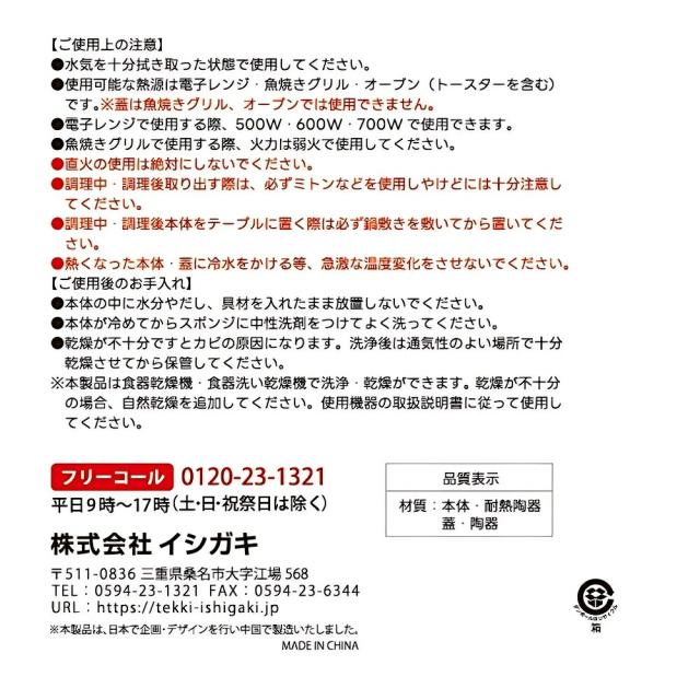 | 商品名: イシガキ産業 DLレンジ陶器プレート 丸型 フタ付 18cm 電子レンジ調理器 焼き魚 焼く 遠赤外線 オーブン 魚焼きグリル 食器乾燥機 食器洗い乾燥機 調理器具 -商品説明- レンジ陶器プレート 丸型 フタ付 18cm 電子レンジで肉・魚が焼ける 電子レンジでのマイクロ波を受けて発熱する特殊素材を配合。 発熱効果で器が上手に温まり、陶器の遠赤外線効果で美味しく調理できる。 魚を焼く時のポイント1 本体のみを電子レンジに入れて600Wで1分30秒余熱 魚を焼く時のポイント2 食材をのせて600Wで加熱(食材の水分はキッチンペーパーでよく拭き取ってください) 魚以外の料理も 魚以外の料理も作れます。レシピ付き 食器乾燥機・食器洗い乾燥機で洗浄・乾燥ができる -特徴・品質- ・電子レンジで手軽に焼き魚や肉が調理できる発熱素材を配合。 ・陶器の遠赤外線効果で食材をふっくら美味しく仕上げる。 ・電子レンジ・オーブン・魚焼きグリル対応で多用途に活躍。 ・付属のフタを使用して、電子レンジで蒸し焼き調理が可能。 ・食器洗い乾燥機・食器乾燥機対応でお手入れ簡単。 ・魚以外の料理にも使えるレシピ付き。 -仕様- ・サイズ:(約)幅23×奥行21.5×高さ9cm ・本体重量:(約)1.172kg ・素材:本体/耐熱陶器、フタ/陶器 ・生産国:中国 ・対応熱源:電子レンジ・オーブン・魚焼きグリル(※フタは電子レンジのみ使用可) -機能- ・電子レンジで予熱し、焼き目のついた香ばしい仕上がりに。 ・魚焼きグリルやオーブンでも本格調理が可能。 ・付属のフタを使えば蒸し焼き調理も可能。 ・お手入れ簡単で、食器洗い乾燥機にも対応。 -使用・手入れについて- ・本製品は、高出力器具(業務用)のレンジには使用出来ません ・水気を十分拭き取った状態で使用してください ・使用可能な熱源は、電子レンジ、魚焼きグリル・オーブン(トースターを含む)です (蓋は魚焼きグリル・オーブンでは使用できません) ・電子レンジで使用する際、500W・600W・700Wで使用できる ・魚焼きグリルで使用する際、火力は弱火で使用してください ・直火の使用は絶対にしないでください ・調理中・調理後取り出す際は、必ずミトンなどを使用しやけどなどには十分注意してください ・調理中・調理後本体をテーブルに置く際は必ず鍋敷きを敷いてから置いてください ・熱くなった本体に冷水をかける等、急激な温度変化をさせないでください ご使用後のお手入れ ・本体の中に水分やだし、具材を入れたまま放置しないでください ・本体が冷めてからスポンジに中性洗剤をつけてよく洗ってください ・乾燥が不十分ですとカビの原因になります。洗浄後は通気性のよい場所で十分乾燥させてから保管してください -注意事項- ・商品の色はできる限り実物に近づけていますが、ディスプレイ設定や撮影条件により色味が異なる場合があります。ご了承ください。 ・ご注文のタイミングや内容により、購入後のキャンセルや修正が制限される場合があります。 ・同時に複数のご注文があった場合、システム上の遅延により在庫がないにも関わらず購入できてしまう場合があります。そのような場合は速やかにメールでお知らせいたします。 | |||