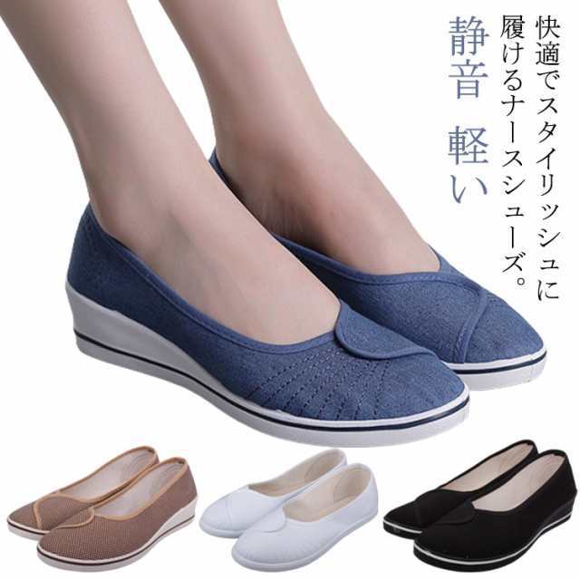 ナースシューズ ウェッジソール お仕事靴 疲れにくい 白 厚底 看護師 キャンバス 通気 ムレ対策 レディース ローヒール パンプス 静音 軽い 衝撃吸収 滑りにくい 立ち仕事 ブラック ホワイト ドットブラウン デニムブルー