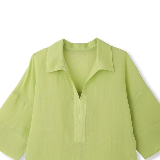 ・ざっくりしたシルエットにシャツ衿Vネックで、夏らしいスタイルに。
