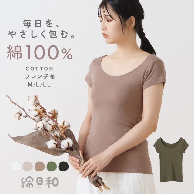 綿日和 綿100% フレンチ インナー シャツ 天然素材 コットン cotton 抗菌防臭 深め 広め 見えない くすみカラー 敏感肌 汗取り パッド付き レディース 春夏 汗染み 防止 汗 対策 シャツ 綿 肌に優しい 送料無料 25SS M9642L-E