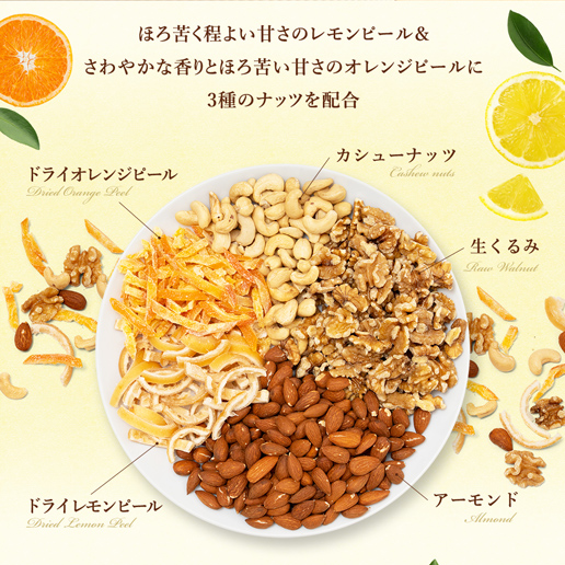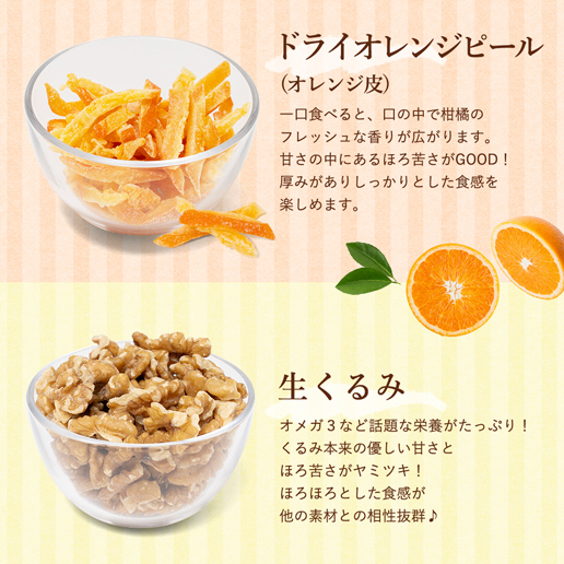 原材料名:アーモンド(アメリカ)、くるみ、カシューナッツ、ドライオレンジピール(オレンジ皮、砂糖)、ドライレモンピール(レモン皮、砂糖)/酸味料、保存料(亜硫酸塩)