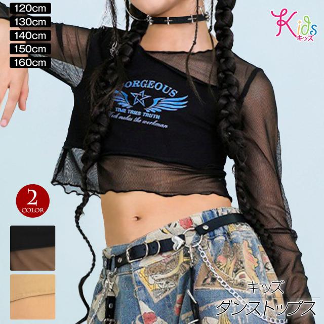 キッズ ダンス衣装 長袖トップス メッシュ シースルー タイト 子供服 へそ出し Y410Y2 [M便 1/3] チア チアガール キッズ 薄手 長袖