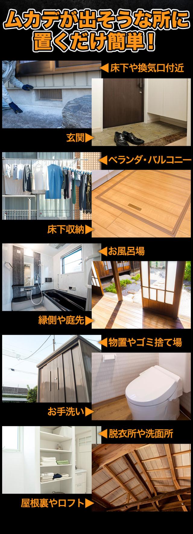 使用方法は、名刺ほどの大きさの不織布の袋を、ムカデが侵入してきそうな窓の近くや、玄関先、家具の隙間などにポンと置くだけ!