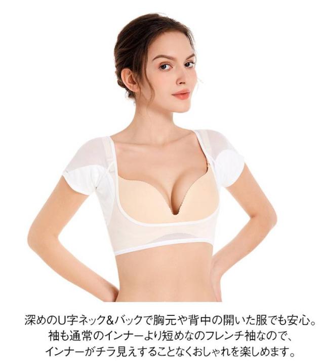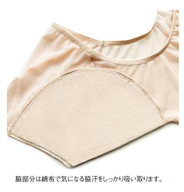 | 汗ばむ季節を快適にする、汗取りインナー。 2枚セット! 脇部分は綿布で気になる脇汗をしっかり吸い取ります。 ストレッチ性も高く、よく伸びます。 脇の下以外の部分がメッシュ生地でムレにくくて、ベタつきにくいので、ドライで快適な着心地! さらさら薄手のインナーですから、アウターに響びにくいです。 深めのU字ネック&バックで胸元や背中の開いた服でも安心。袖も通常のインナーより短めなのフレンチ袖なので、インナーがチラ見えすることなくおしゃれを楽しめます。 | |