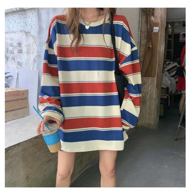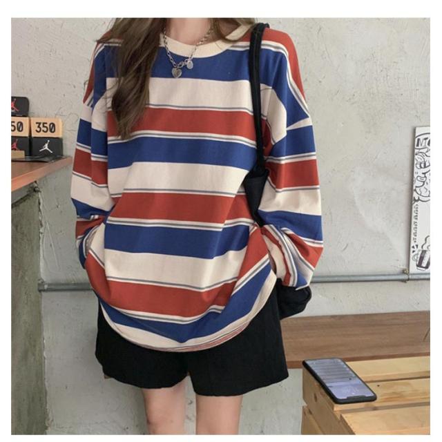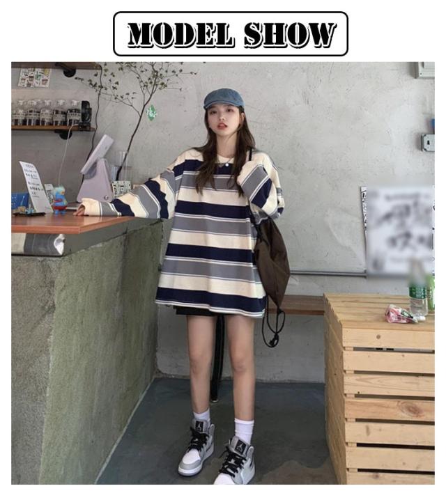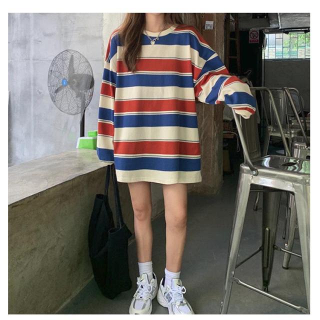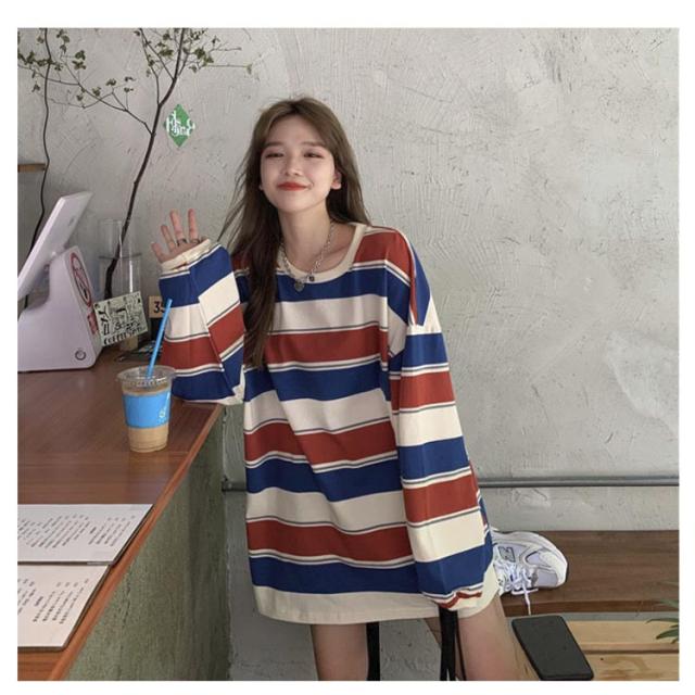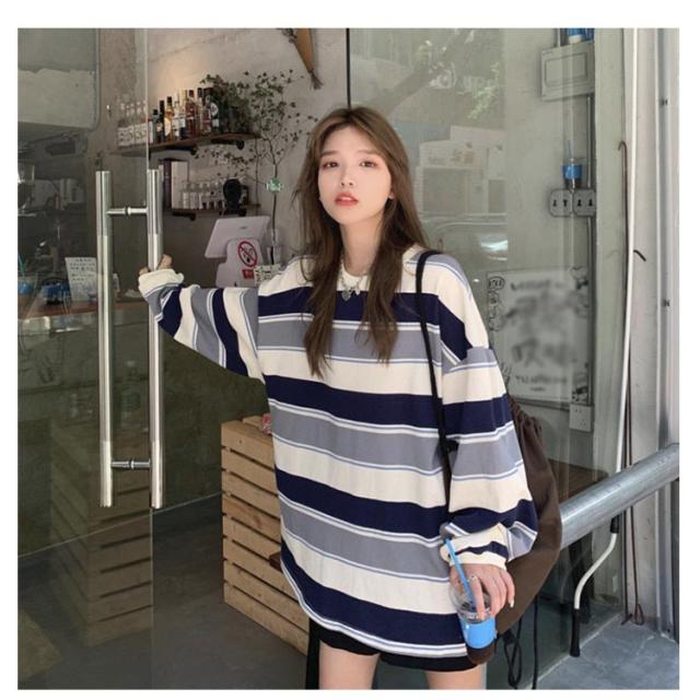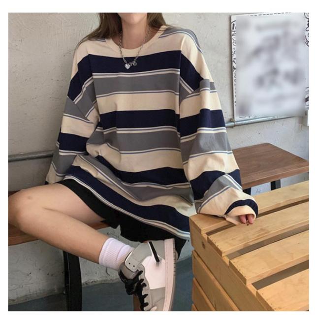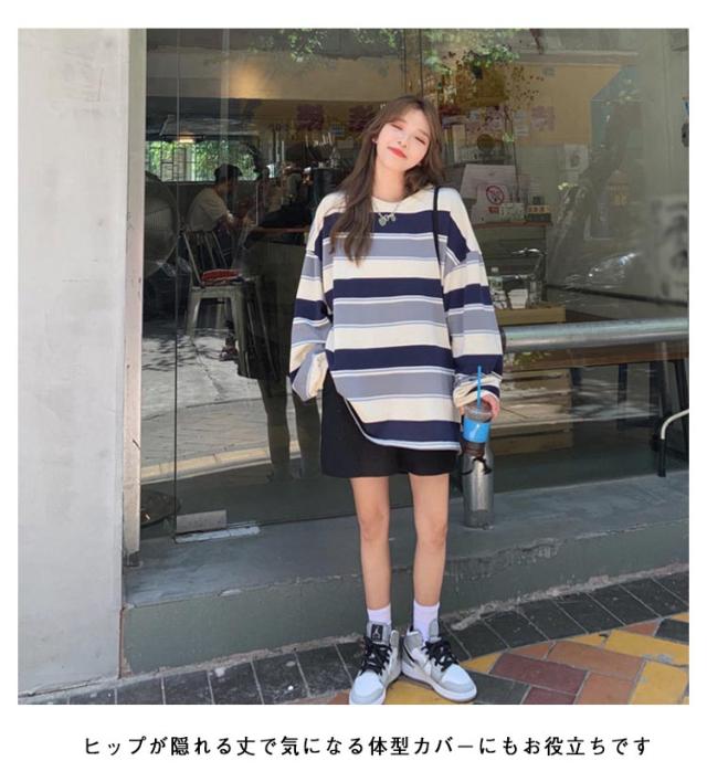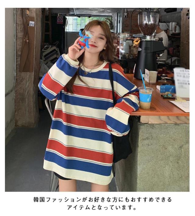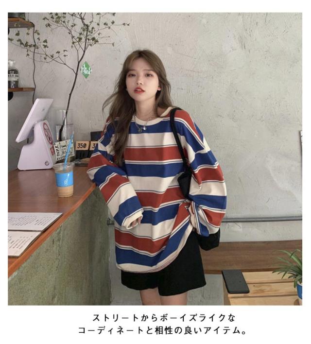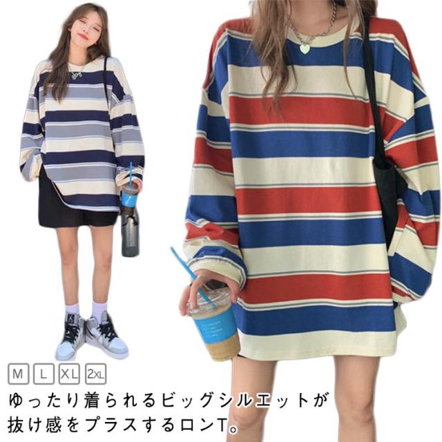 部屋着 tシャツ オーバーサイズ ロンT ゆったり ラウンドネック ビッグシルエット ロンT 秋 トップス 春 レディース 長袖 韓国ファッション 大人 おしゃれ カットソー 丸首 ルームウェア ロングTシャツ 大きいサイズ ボーダー