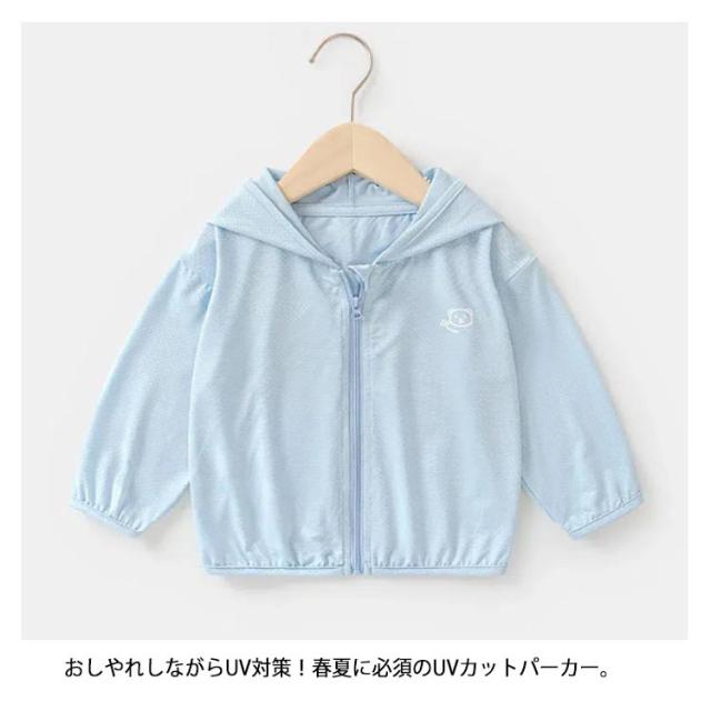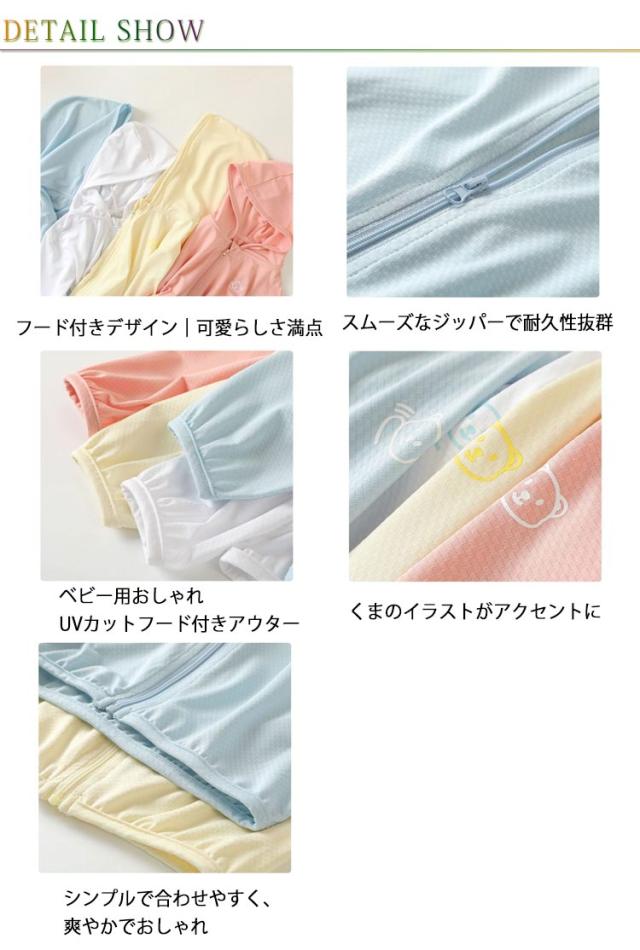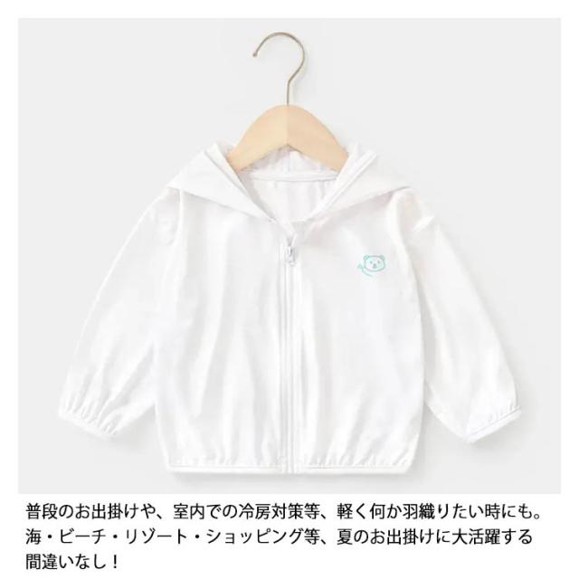 | 80-120cm!UPF50+ 接触冷感 吸汗速乾!おしやれしながらUV対策!春夏に必須のUVカットパーカー。 吸汗速乾性、吸放湿性に優れている高機能性冷感生地を使用、日差しが強い真夏でもサラサラの着心地です。 ラッシュガードにはストレッチの高いスパンデックス生地を採用して動きやすいです。 軽量でコンパクトに畳めるので、バッグの中でもかさばりません。透け感素材が涼しげでおしゃれです。 普段のお出掛けや、室内での冷房対策等、軽く何か羽織りたい時にも。海・ビーチ・リゾート・ショッピング等、夏のお出掛けに大活躍する間違いなし! フード付きデザイン|可愛らしさ満点 ベビー用おしゃれUVカットフード付きアウター スムーズなジッパーで耐久性抜群 くまのイラストがアクセントに シンプルで合わせやすく、爽やかでおしゃれ | |