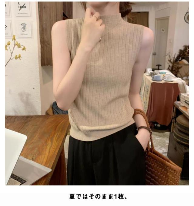 トップス ノースリーブニット サマーニット リブ編み ハイネック ハイネック タンクトップ レディース 夏ニット シンプル ニットベスト セクシー タイト インナーニット プチハイネック 無地