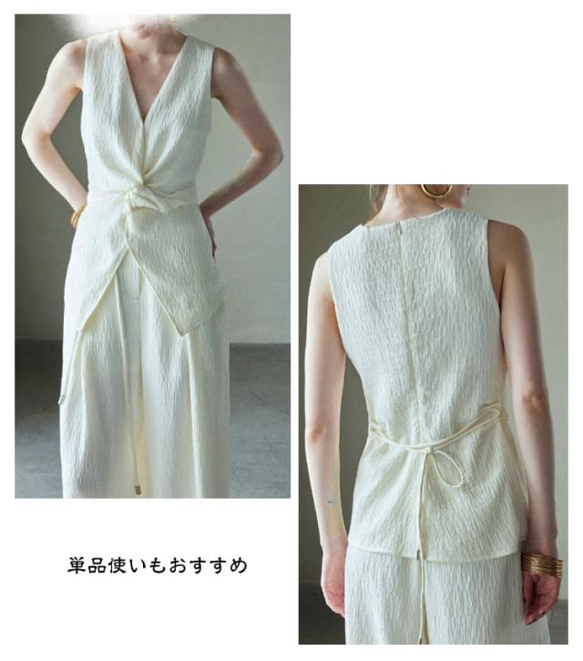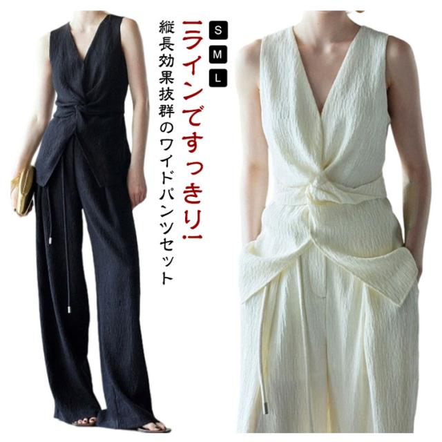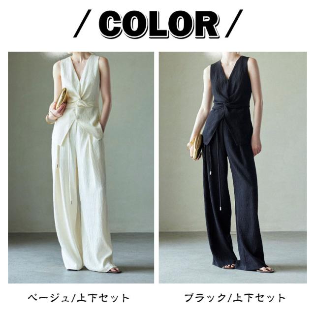 ロング セットアップ 春夏 パンツ ワイド ジレ 袖なし ノースリーブ タンクトップ セットアップ ロングパンツ 上下 きれいめ 2点セット レディース パンツスーツ ガチョウパンツ ガチョウ パンツドレス しわ加工 体型カバー