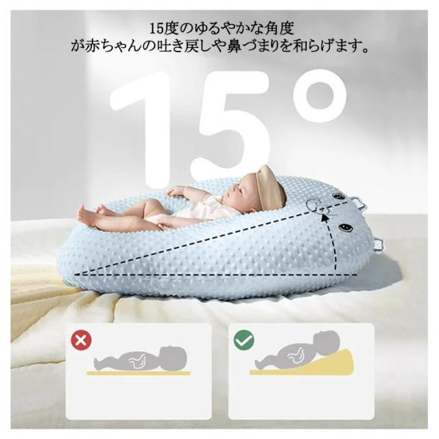 | 中心のくぼみが背中のCカーブをつくり、赤ちゃんの眠りやすい姿勢にしてくれます。 15度のゆるやかな角度が赤ちゃんの吐き戻しや鼻づまりを和らげます。 腰のあたりから寝かせてゆったりと頭をあげることで、赤ちゃんへの負担もなく、吐き戻しや鼻づまりを和らげ呼吸をスムーズに。 姿勢をキープすることができ、背骨の発育を守りながら、まるで抱っこされているような感覚で眠ることができる赤ちゃんに優しいベッドです。 おしりと背中がフィット、寝姿勢から不安を取り除き、安心して眠れる。 カバーを剥して洗濯できるので、赤ちゃんが汗をかいたときや吐き戻ししたときに簡単に洗えるので便利! ご出産のお祝いや、お誕生日のプレゼントに最適! | |