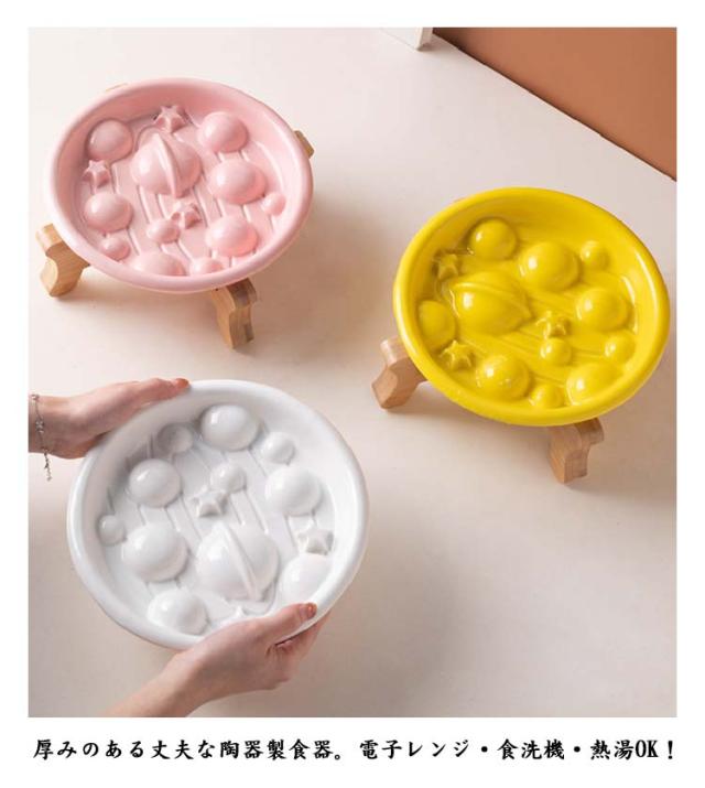 | 便利な陶器製早食い防止皿 木製スタンド付き ボールと星の凸凹が邪魔をして、フードの丸飲みを抑制し食事速度を軽減! おしゃれで安定感のある木製スタンド付き!高さがあるのでで食べやすく、ペットの体への負担を和らげ、ラクな姿勢で食事ができます。 厚みのある丈夫な陶器製食器。電子レンジ・食洗機・熱湯OK! 去勢・避妊後の肥満予防にも効果的! 喉につまる、消化不良、肥満などの問題を解消でき、健康的な食べ方を促進します。 | |