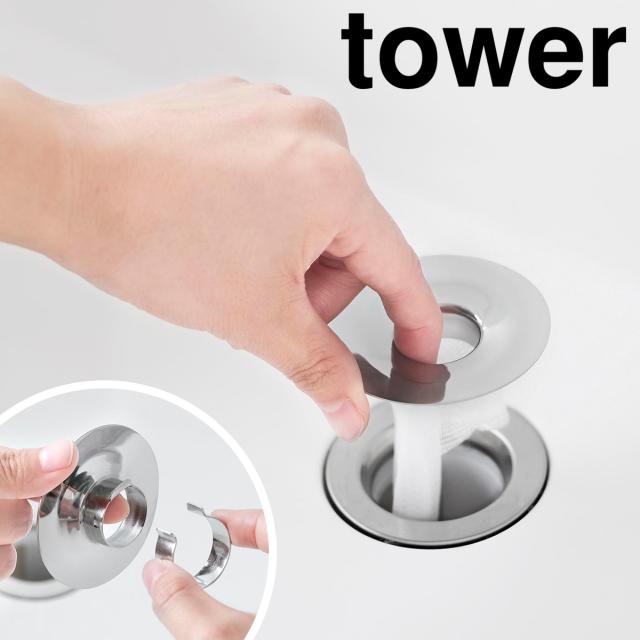 排水口ネットを挟むだけ 洗面台用ヘアキャッチャー 洗面台排水口に備え付けのゴミ受けは、カタチが複雑でお手入れが面倒。そんなプチストレスを解消してくれる『 tower( タワー )洗面排水口ゴミ受けネットホルダー 』。ステンレスのリングに市販のネットを掛けて、排水口にセットするだけのシンプル設計。ネットの落下を防ぐロック構造で、髪の毛や細かいゴミをしっかりキャッチします。ゴミの処理はネットを外して捨てるだけで手間いらず。網目がないのでホルダーの洗浄もラク。洗面台まわりを清潔に保てる便利アイテムです。