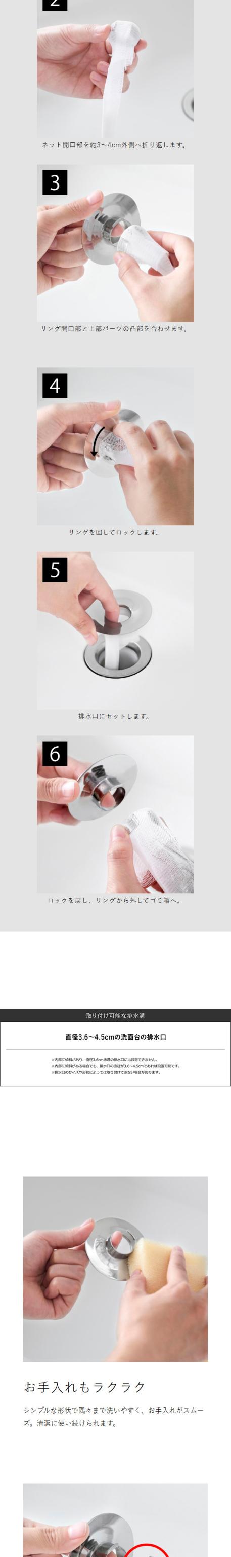 ステンレスのリングに市販のネットを掛けて排水口にセットするだけの洗面排水口ゴミ受けネットホルダー。ネットの落下を防ぐロック構造で髪の毛や細かいゴミをしっかりキャッチします。