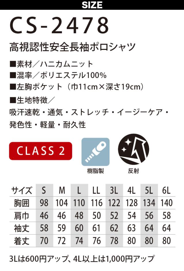 コーコス 高視認性安全長袖ポロシャツ CS-2478 4L 5L 6L 高視認性安全服 CLASS2 吸水速乾 通気性 ストレッチ イージーケア 発色性 軽量 耐久性 夜間作業 道路工事 春夏用 男女兼用