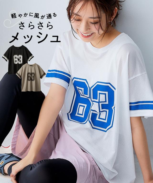 「毎日着たくなる、涼しい一着。」 スポーツラインにオリジナルのアクティブウェアが初登場! アクティブなシーンだけでなく、おしゃれ着としても着用できます。 ■デザイン 夏にぴったりなメッシュ素材のアクティブウェア。 インパクトのあるナンバリングデザインと袖のラインプリントが今っぽく、おしゃれ見えするポイント。 袖丈は長めなので気になる二の腕回りをカバー。 こなれて見える大きめのシルエットで肌に張り付かず、ゆるっと着用できます。 ■素材 さらっと爽やかなメッシュ素材。 透け感のある素材なので涼しい、軽い、乾きやすいのが特徴です。 また、汗をかいても水に濡れても乾きやすく、風通しが良いので一日中快適にお過ごしいただけます。 水陸両用素材なので街でもプールでも海でも様々なシーンで使用できる万能Tシャツです。 ジムやスポーツなどのアクティブなシーンやリラックスシーン、街中でのタウンユースコーデとしてなど幅広く着用できます。 ■コーディネート 見せるインナーの上から一枚着用するだけで今っぽく透け感のあるコーデに。 パンツやスカートなどいつものアイテムとコーデするだけでトレンド感のあるスポーツミックスコーデにもなります。