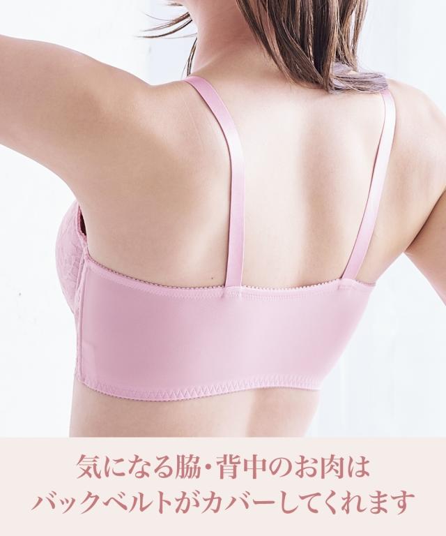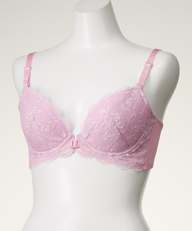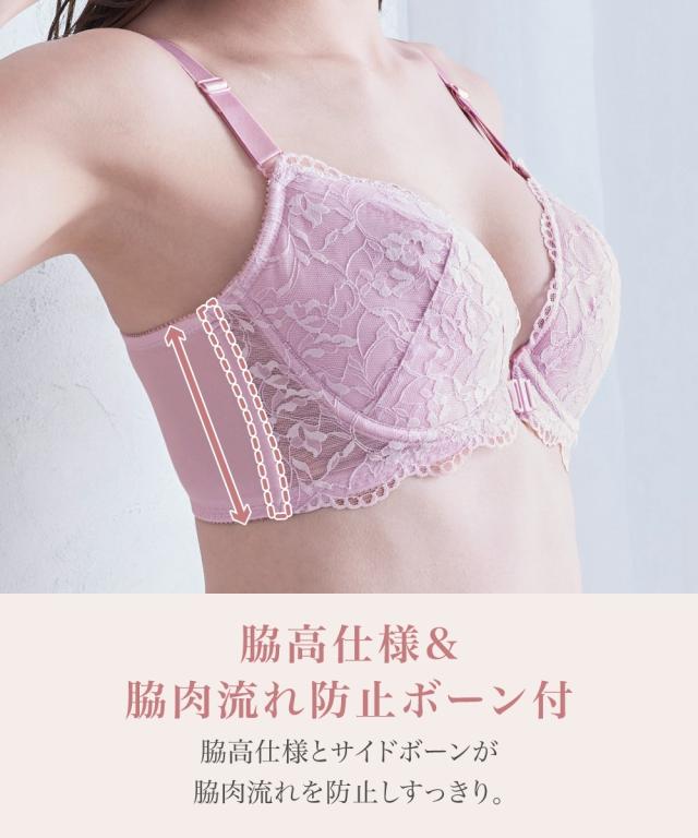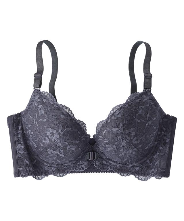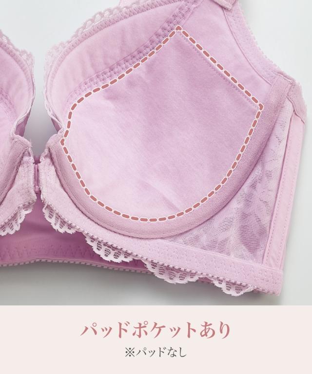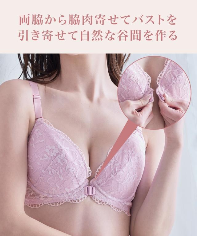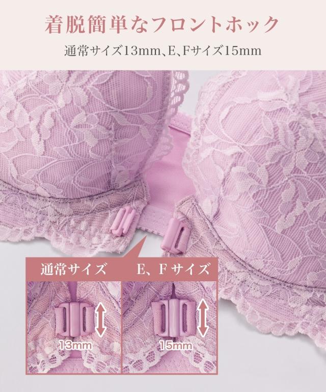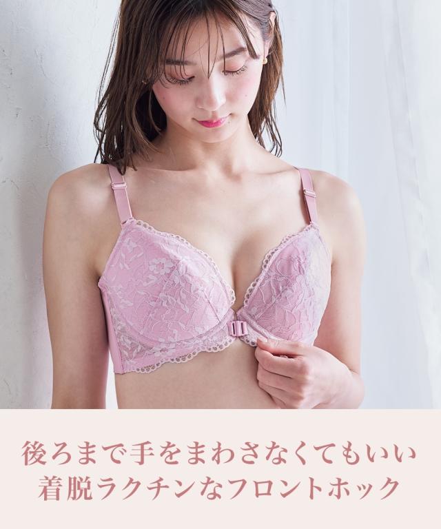 フロントホックで自然な谷間 こだわりポイント ・両脇から脇肉&バストを引き寄せて自然な谷間をメイク ・着脱簡単なフロントホックタイプ ・ホックがないから背中すっきり ・フロントホックはカップサイズに対応した仕様だからどんなサイズでも安定した着用感 ・ストラップは前アジャスターで調整しやすい ・ストラップは少し太めでズレにくい