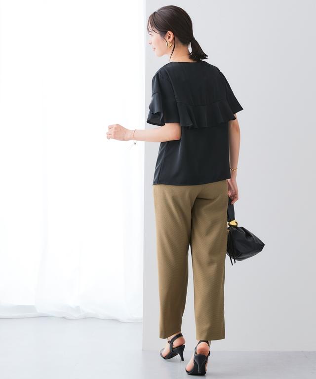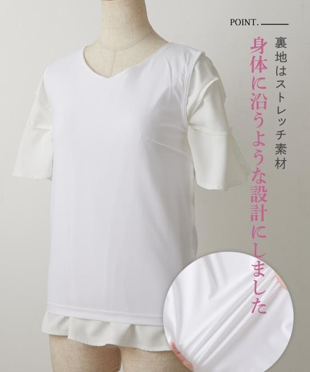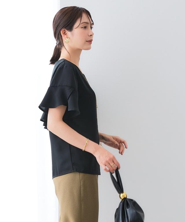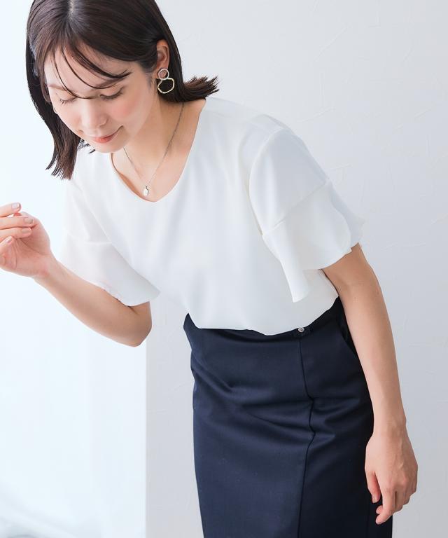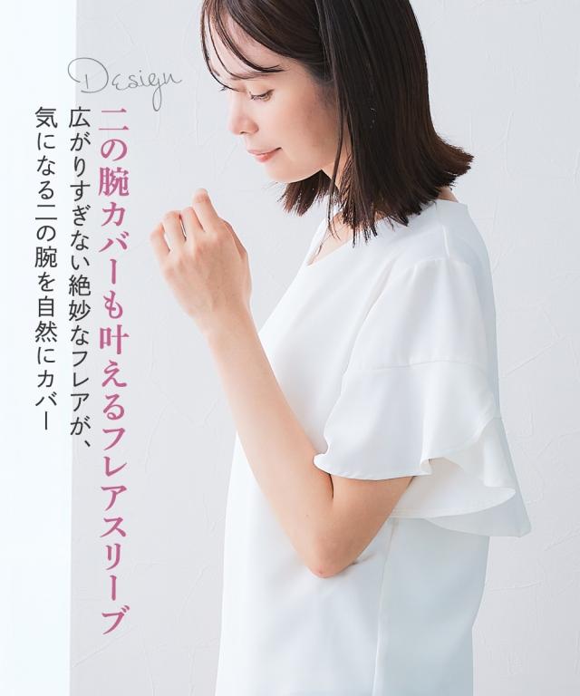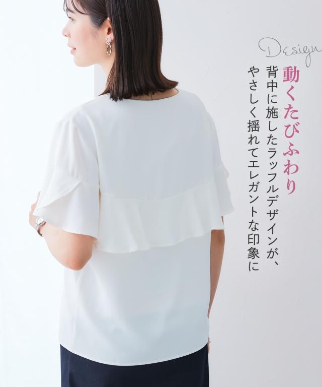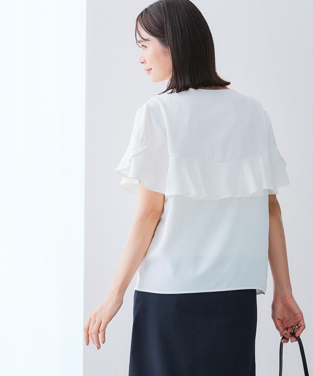 【胸元チラ見えしにくい】フレア袖バックラッフルVネックブラウス(しわになりにくい・接触冷感)