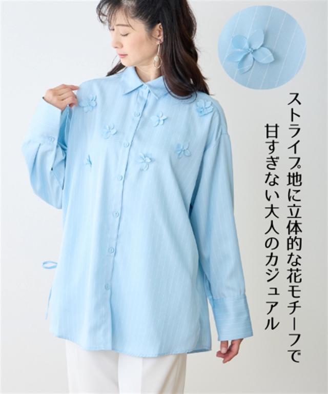ストライプ地に立体的なお花のモチーフで甘すぎない大人のカジュアル ■デザイン 程よい間隔のストライプ柄できっちりしすぎず、緩すぎない絶妙な抜け感のあるシャツに仕上がっています。胸元には立体的な花びらが施されており着るだけでシーズンライクな装いに。ヒップがすっぽりと隠れる丈で気になるウエストやヒップ周りをカバー ■素材 さらりとすべりが良く、程よい厚みとハリのある素材