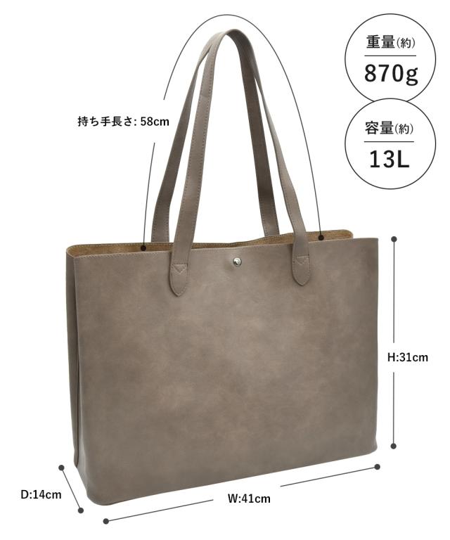 材質=合成皮革 サイズ=たて約31×よこ(上部)約41(底部)約41×まち幅約14cm 開閉=ファスナー 持ち手長さ=約58cm 調整不可 取り外し不可 重量=約870g 原産国:中国製 備考:※サイズの誤差は多少発生します。