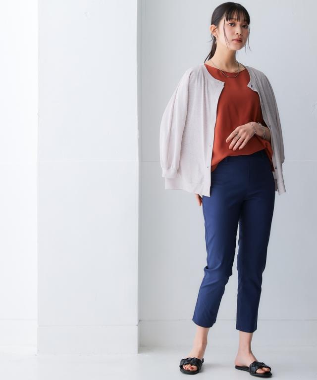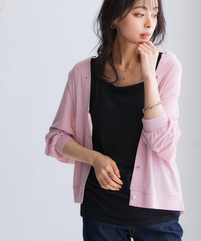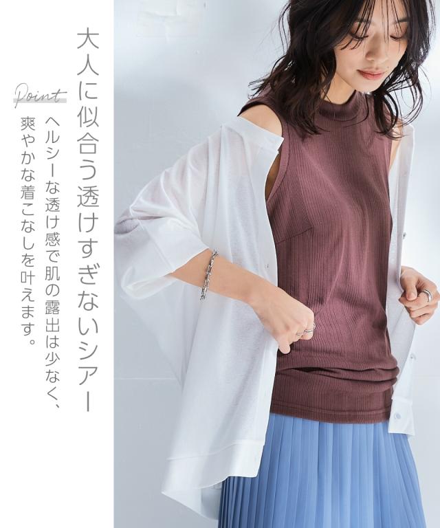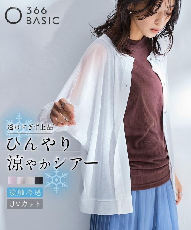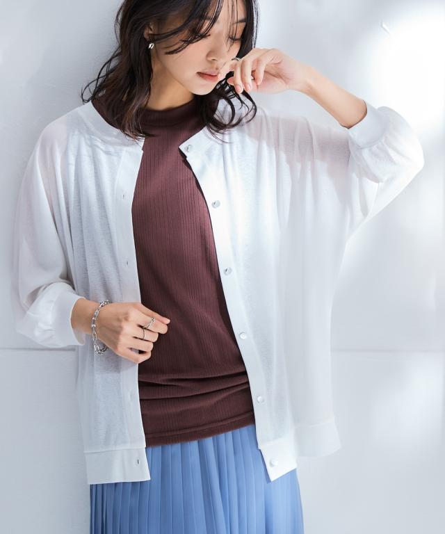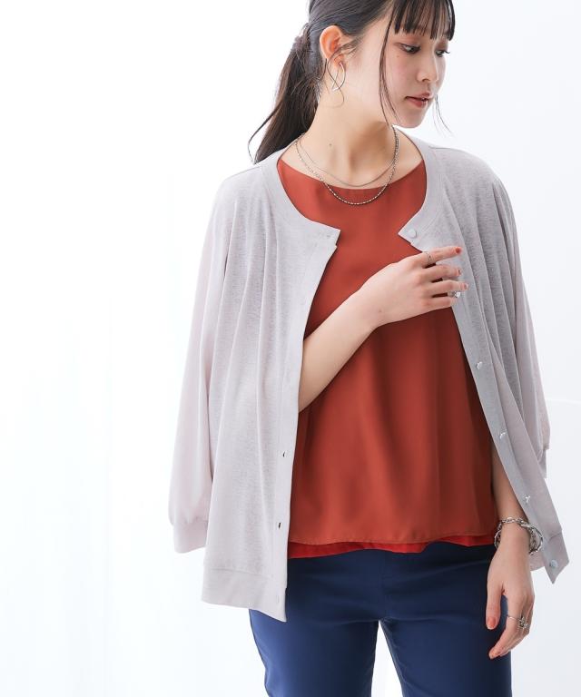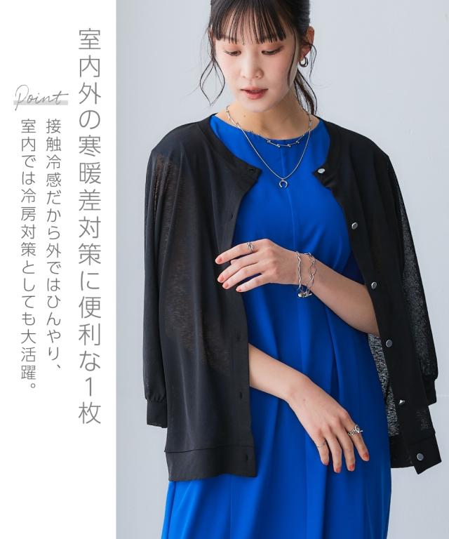 旬のシア素材がスラブ調に進化!透け加減がが上品で着やすくなって登場!ゆったりシルエットで重ね着しやすい! ■デザイン なんにでも合わせやすい丸首。重ね着しやすい少しゆるっとしたデザイン。体型も拾いにくく涼しい。七分袖なので気になる二の腕をしっかりカバーしてくれます。華奢な手首を出せる袖丈なのでスッキリ見せてくれます。フロントのシルバーボタンがポイントになってくれるのでいつものコーディネートを華やかに見せてくれます ■素材 スラブ調になっているので透けすぎず、トライしやすいシア素材です。夏に嬉しい接触冷感とUVカット付でひんやり涼しく着用できます ■おすすめのスタイリング 中にタンクやキャミソール、ハイネックを合わせてもOK。プリントTシャツを下から透けさせるのもお勧め。ノースリーブワンピースの上から着るだけでおしゃれに決まります。丈が長すぎないので分量感のあるワンピースやスカート、パンツとも相性良し。意外と着回しがきく便利な1枚。