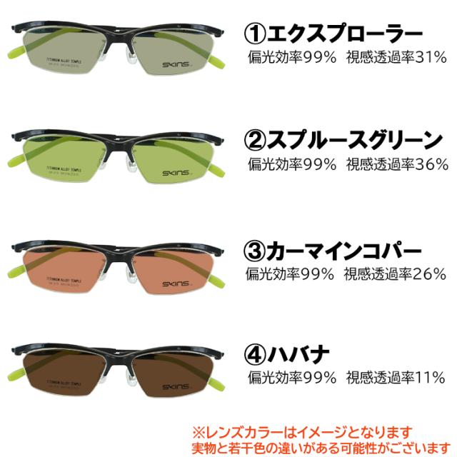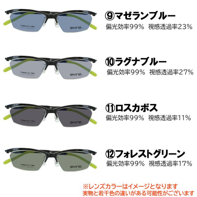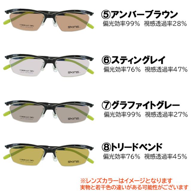 偏光サングラス メンズ UVカット 度付き可 ブランド SKINS スキンズ スポーティー 弾性樹脂 βチタン ハーフリム SK-313 スクエア 車 運転 ドライブ 釣り グレー系 ブルー系 グリーン系 ブラウン系 高機能 RARTS アーツ 偏光レンズ 日本製レンズ