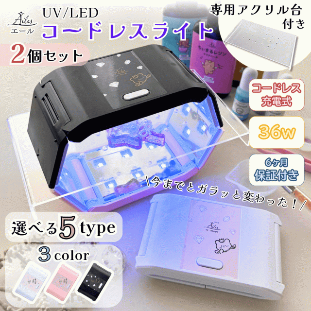 UVライト uvレジンライト コードレスライト 2個セット 折り畳み 充電式 6ヶ月保証 ハンディ 持ち運び 便利 ネイルライト レジン ライト ランプ 硬化 必須 UV/LED ジェルネイルライト ハイパワー 折りたたみ式 コンパクト 選べる3color 5種類 オリジナル Ailesエール