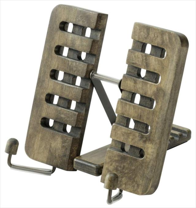 フラットに折りたためて便利。様々なシーンで活躍する木製ブックスタンド。 本はもちろん、タブレット端末スタンドとしても便利。 1、 折り畳むと12mm厚に。場所をとらずに収納でき、持ち運びに便利です。 2、 回転式のページ押さえは、アームを動かすことで、載せる本の厚さに合わせてぴったり押さえることができます。左右異なる厚さで押さえることができます。 3、 5段階の角度調整が可能。お好みの角度で使用できます。 4、 格子柄のデザインは見た目に楽しいだけでなく、本体の反り防止の役割も担っています。