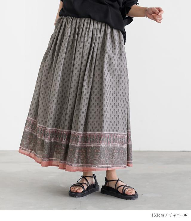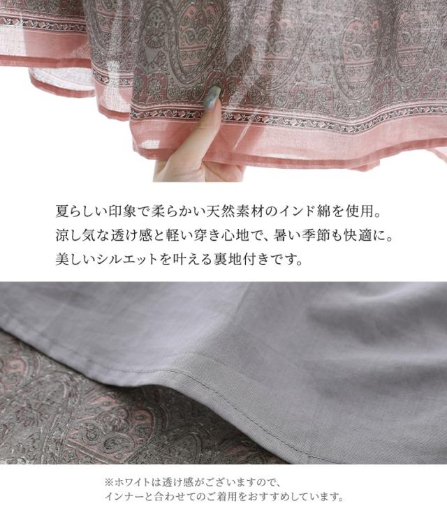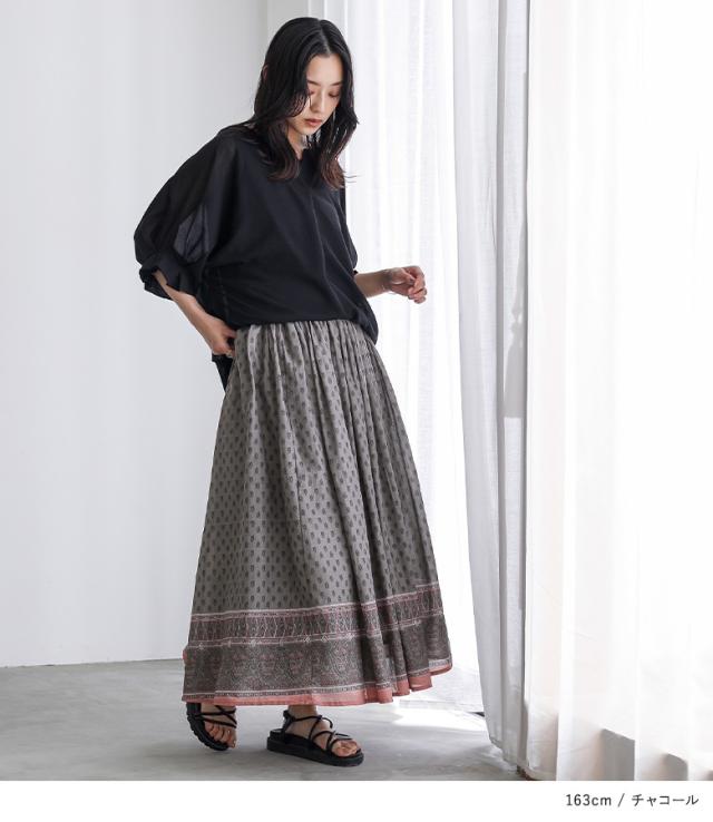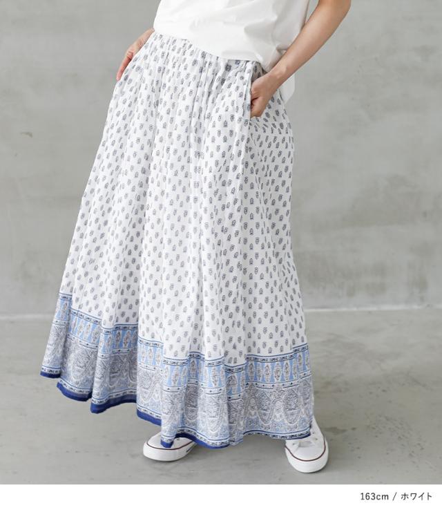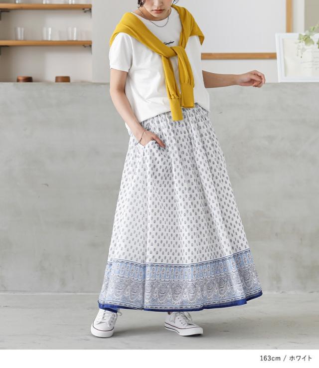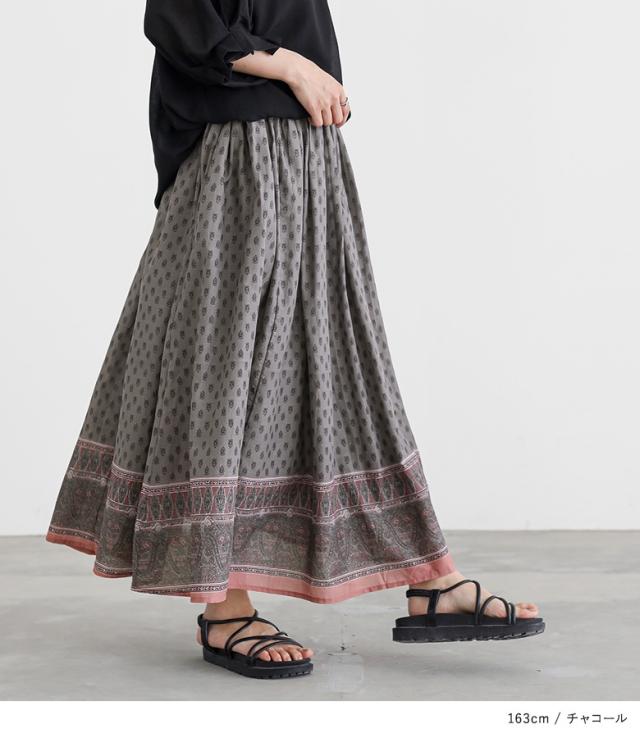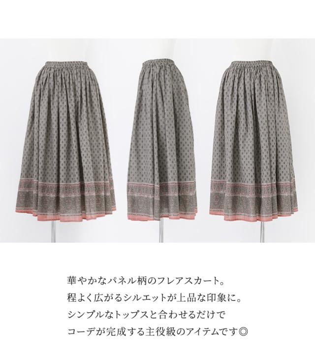 『パネルフレアスカート』【メール便不可】【20】[フレアスカート ロング レディース ボトムス パネル柄 裏地付き ポケット ウエストゴム コットン100% インド綿 薄手 涼し気 カジュアル きれいめ 春 夏]