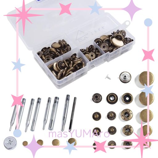 【セット内容:】:【ホック合計60組】:1バネホック10mm×12組 2バネホック12mm×12組 3バネホック15mm×12組 4ジャンパーホック17mm×12組 5ジーンズボタン17mm×12組。【打ち具合計9点】:655#10mm用*2本 。633#12mm用*2本。831#15mm用*2本。201#17mm用*1本 。ハトメ抜き : 2.5mm*1本。打ち台*1個(こちらの商品には説明書は付いております。ご了承のほどお願い申し上げます。)
