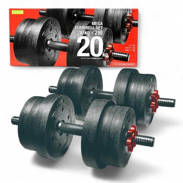 10kg×2セットの重量可変式ダンベルセット!プレートを入れ替えて重量調節ができるので、初心者でも使いやすいダンベルです。