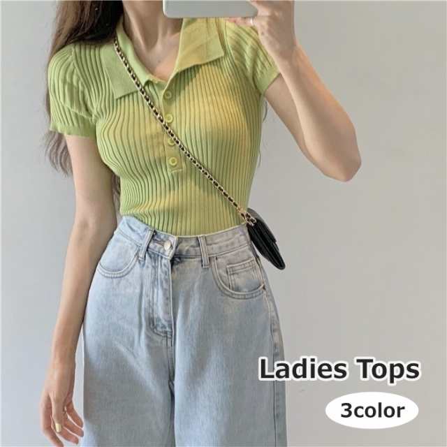 ポロシャツ ニット レディース 女性 トップス 半袖 リブ 襟付き 無地 単色 シンプル かわいい おしゃれ サマーニット
