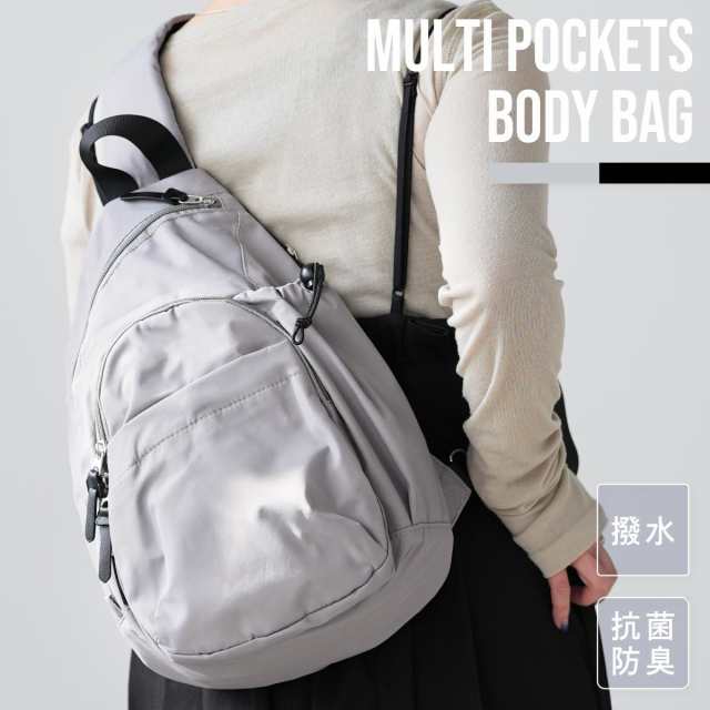 7つのポケット仕様と機能性生地を使用したボディバッグ。