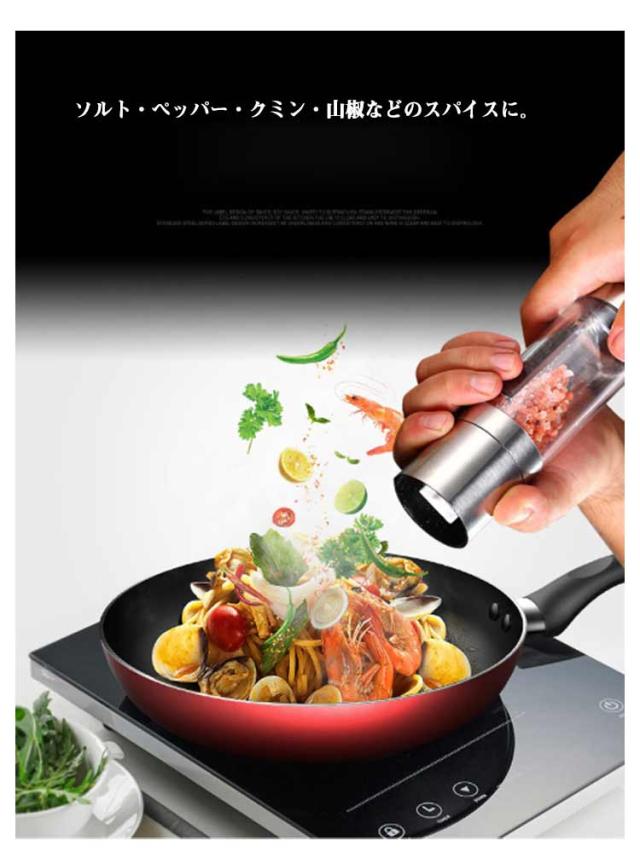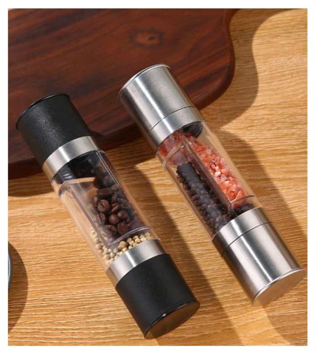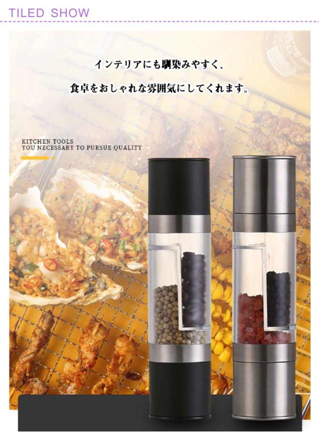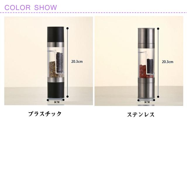 | 2種調味料入れるペッパーミル。【プラスチック/ステンレス2タイプ】 ソルト・ペッパー・クミン・山椒などのスパイスに。 ネジを回して粗さを調整できるので、個人の好みとニーズによって最適の粗さを調節可能です。 インテリアにも馴染みやすく、食卓をおしゃれな雰囲気にしてくれます。 | |