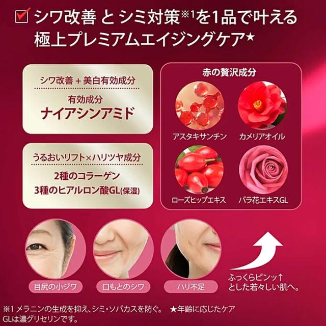 ナイアシンアミド※、 精製水、ジプロピレングリコール、1,3−ブチレングリコール、濃グリセリン、エタノール、メドウフォーム油、ポリエチレングリコール・デシルテトラデセス−20・ヘキサメチレンジイソシアネート共重合体、ジカプリン酸プロピレングリコール、ポリオキシエチレングリセリン(26E.O.)、アスタキサンチンH、アセチル化ヒアルロン酸ナトリウム、ツバキ油、ノバラエキス、バラエキス、ヒアルロン酸ナトリウム(2)、加水分解コラーゲン末、加水分解ヒアルロン酸、水溶性コラーゲン液(A)、天然ビタミンE、2−エチルヘキサン酸セチル、N−ステアロイル−N−メチルタウリンナトリウム、アクリル酸・メタクリル酸アルキル共重合体、グリセリン脂肪酸エステル、ジグリセリン、ジブチルヒドロキシトルエン、ジペンタエリトリット脂肪酸エステル(1)、セトステアリルアルコール、トリ(カプリル・カプリン酸)グリセリル、ベヘニルアルコール、メチルポリシロキサン、モノパルミチン酸ソルビタン、ラウリン酸カリウム、リン酸一水素ナトリウム、リン酸二水素ナトリウム、植物性スクワラン、水酸化ナトリウム、フェノキシエタノール、メチルパラベン、香料、カラメル ※;有効成分 無印;その他の成分 ※2024.12商品リニューアルにつき変更