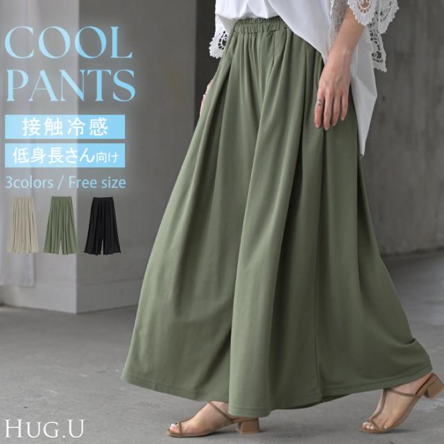 パンツ ワイド 接触冷感 低身長 さん向け ワイドパンツ レディース ロング 体型カバー ボトムス ボトム フレア ストレート ズボン ゆったり ゴム ハイウエスト ストレッチ ポケット ひんやり 美脚 無地 大きいサイズ きれいめ 黒 カーキ 春 夏 HUG.U 秋新作
