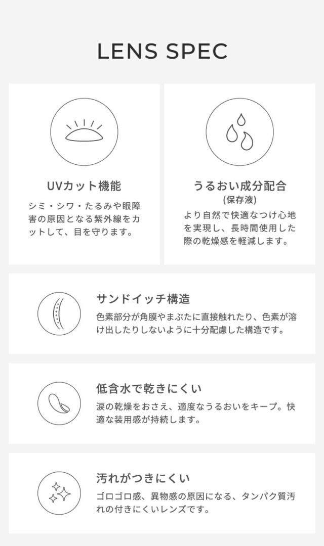 レンズ直径: ニュートラルブラウン・アンニュイグレー・リトルブラウン・エアーベージュ…14.2mm、カーキブラウン・ドーリーブラウン・…14.5mm