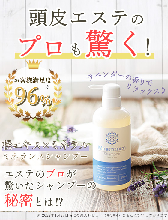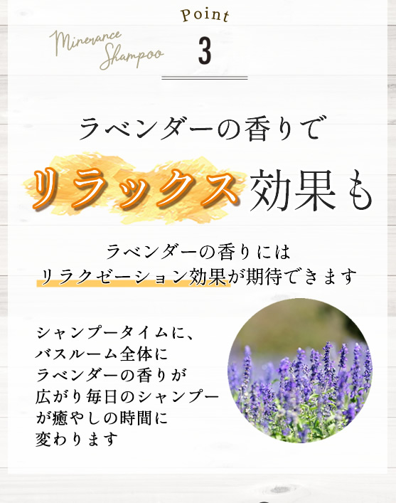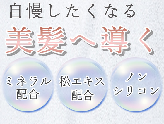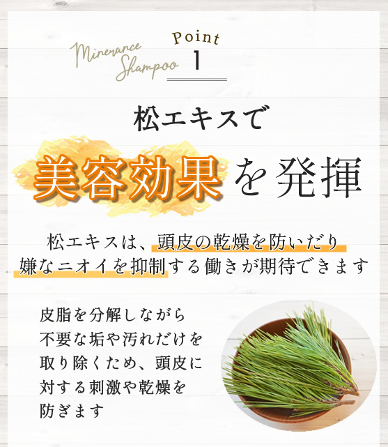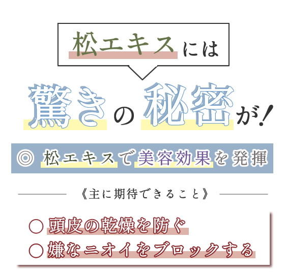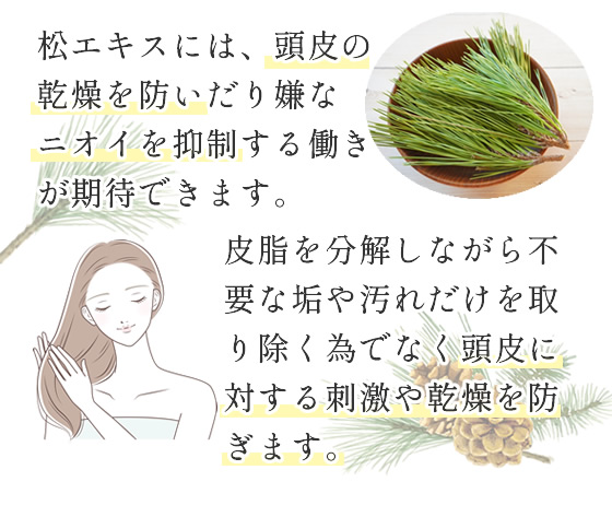 松エキスは頭皮の臭いや整肌効果にも優れ、さらに痛んだ髪に充分なミネラル補給を行なうことで、自然な潤いを保ちます。