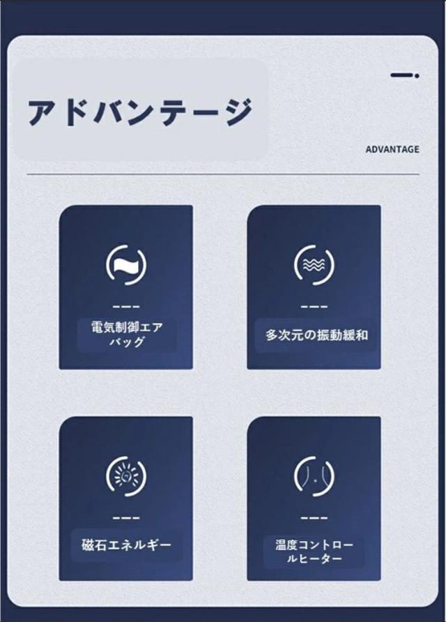 2つ振動点にデザインされて、振動の幅が全腰をカバーし、より深くて強くマッサージする。マッサージモードが4種類があり、お好みに合わせて振動レベルを選択出来ます