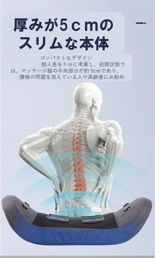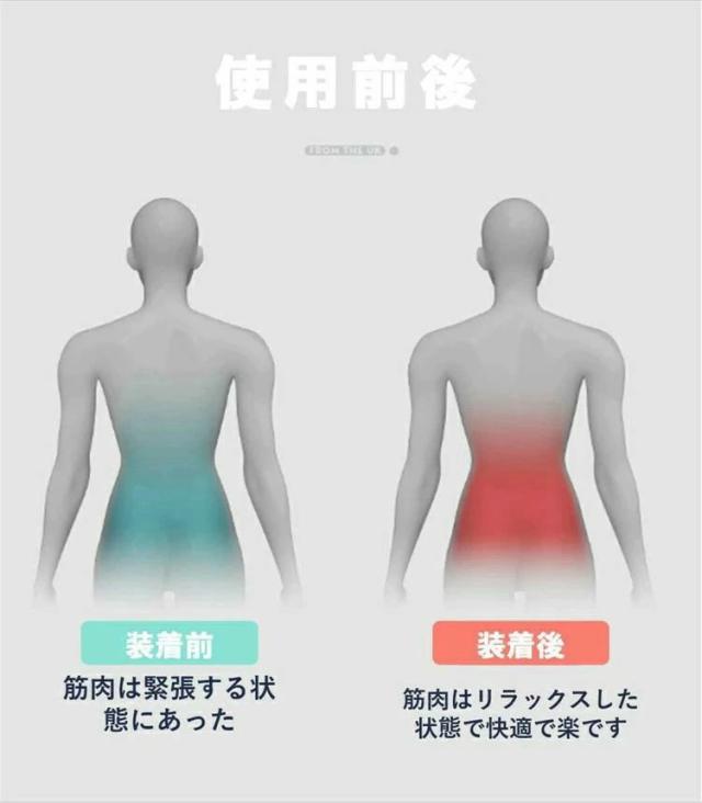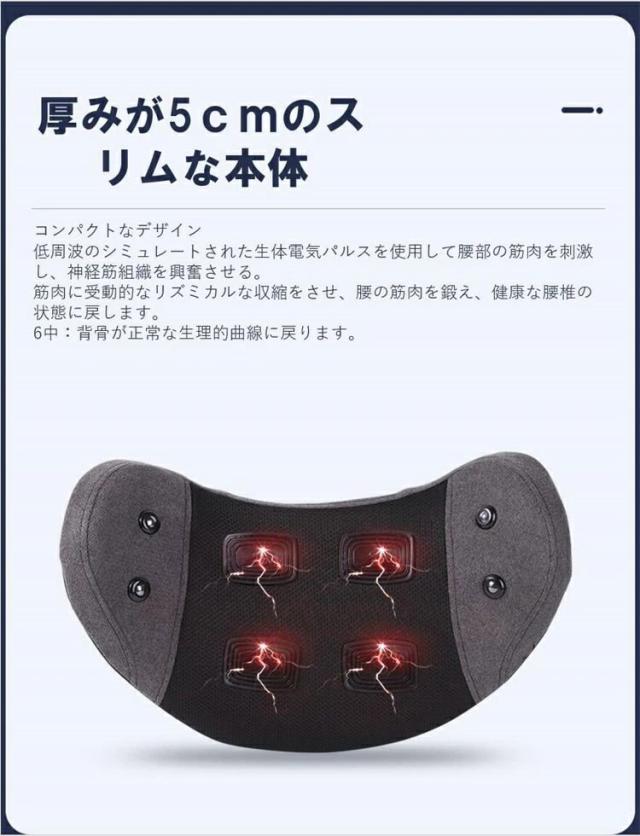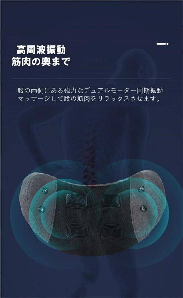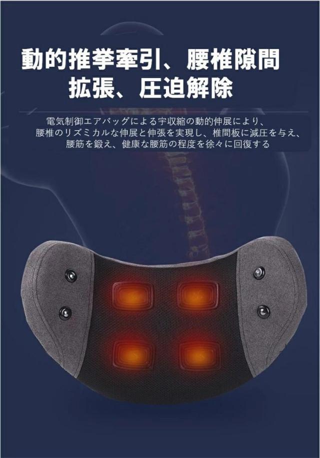 マッサージ機の中にはマグネットが4個内蔵されて、穴に当たってマグネット理療を行い、3秒快速発熱し腰部を温めて、4段階温度調節可能、揉みほぐし筋肉痛緩和、ストレス解消、湿気除去などの役割が立ちます