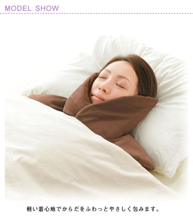 | 首と肩の両方を保護できる肩当てウォーマー。 前開きデザインで着脱が簡単!マジックテープ付きで取り外しラクラク。 軽い着心地でからだをふわっとやさしく包みます。 寝起きの寒さにしばらく着用したままでも使えます。 布団を顔までかぶりたくない人には特にオススメ。 | |