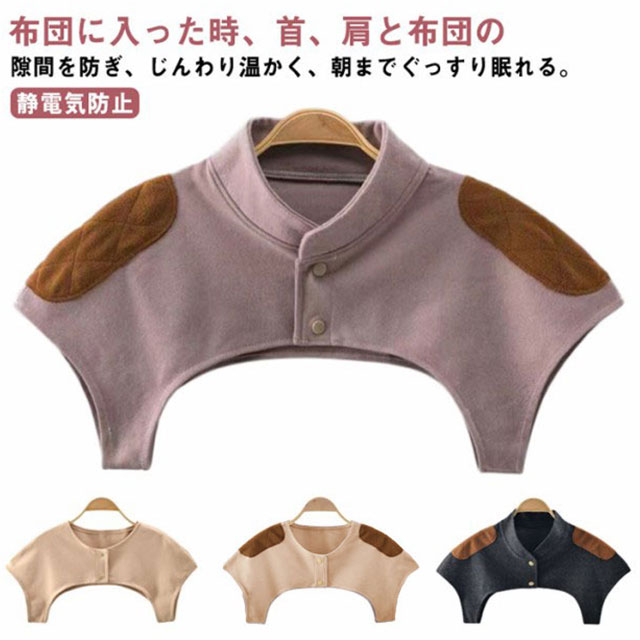| 布団に入った時、首、肩と布団の隙間を防ぎ、じんわり温かく、朝までぐっすり眠れる。 襟付き&ノーカラーの3タイプが用意しております。 肌触りも柔らかくていいし、軽いから肩も凝らないし、寝ている間にずれることはないし、ずっとつけていたいくらいです。 冷えやすい肩を毎日温めて健康に。 五十肩の夜間痛対策にも最適。 寝る時はもちろん、室内でのショール代わりにお風呂上りにもおすすめ! | |