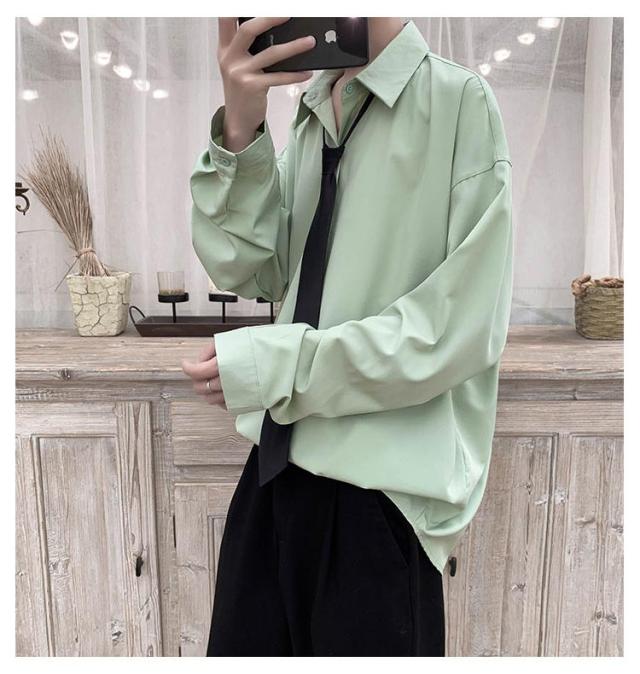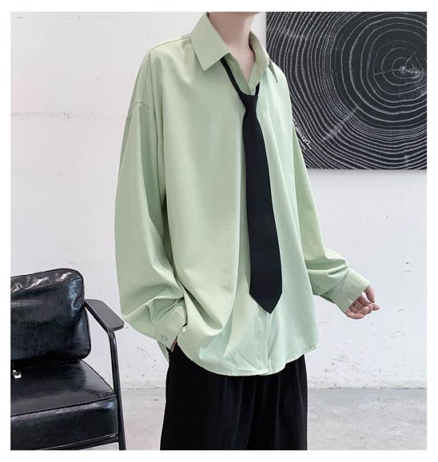2点セット カジュアルシャツ メンズ とろみ 無地 ドロップショルダー 長袖 シャツ ネクタイ付き 韓国 長袖シャツ 春夏 春服 秋冬 韓国ファッション ストリート系 原宿系 ダンスウエア ダンス衣装