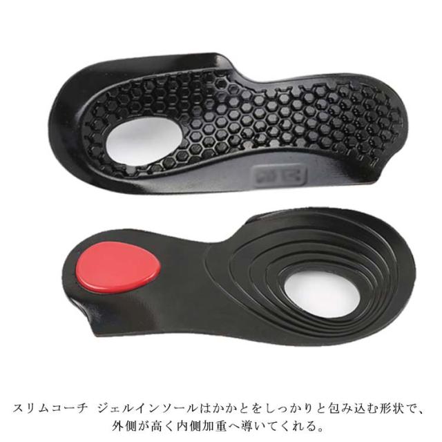 | 外側に偏った足裏の負担を正しく整えて、歩き方から美脚に導くインソール スリム ジェルインソールはかかとをしっかりと包み込む形状で、 外側が高く内側加重へ導いてくれる。 О脚、扁平足、足底筋膜炎、回内足、膝の痛みなどの軽減に適応しています。 カラダの衝撃吸収の役割も持つ「アーチ」の崩れをケアするため運動におけるカラダへの負担をやわらげます。 | |