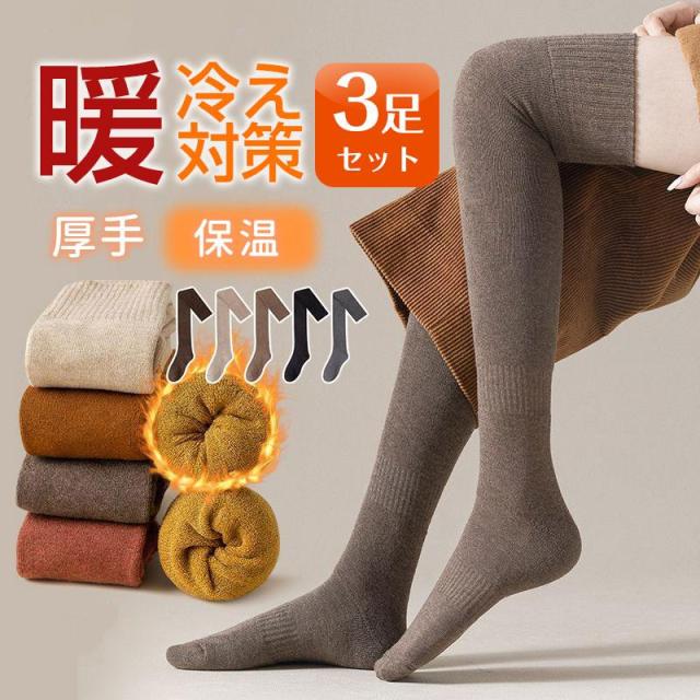 ロング丈 3足セット 靴下 レディース ハイソックス 厚手 冷え取り 保温 裏パイル 綿混 吸湿 発熱 着圧 弾性 冷え対策 オフィス アウトドア