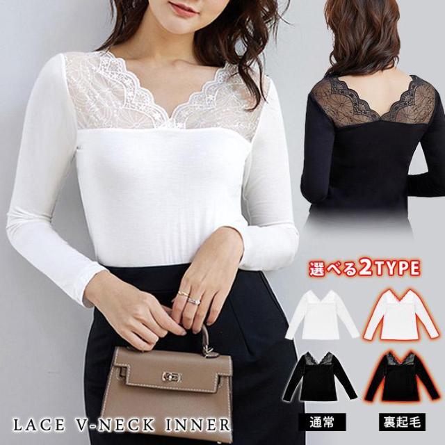 トップス レディース 春 夏 春夏 黒 白 裏起毛 カットソー 長袖 インナー 下着 あったか レースインナー Vネック インナー 無地 ブラック ホワイト 送料無料