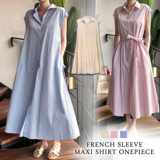 ワンピース レディース 春 夏 春夏 シャツワンピース ロングワンピ ロングシャツ マキシワンピ ストライプ ベージュ ピンク ブルー 20代 30代 40代 送料無料