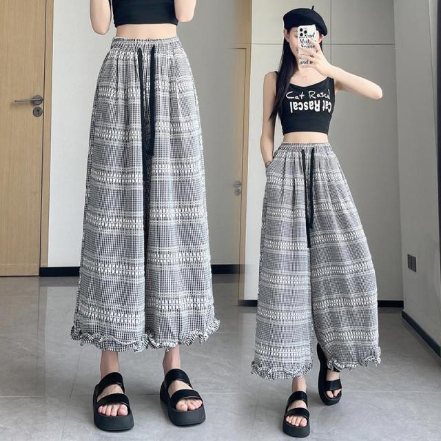 フレアパンツ ウエストゴム 紐付き パンツ 夏服 レディース ボトムズ ガウチョパンツ ワイドパンツ チェック柄 リゾート フリル スカーチョ オフィスカジュアル