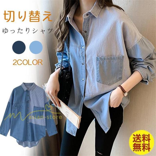 シャツ レディース デニムシャツ シャツブラウス 薄手デニム 長袖 切り替え きれいめ ストライプ カジュアル 大きいサイズ 2XL ライトアウター 春夏秋物 前後差