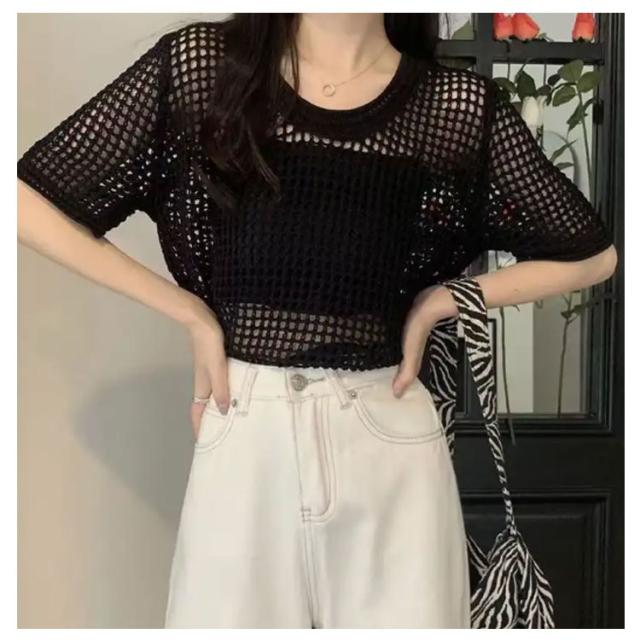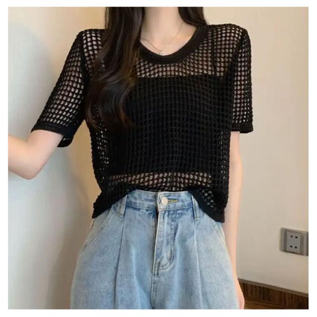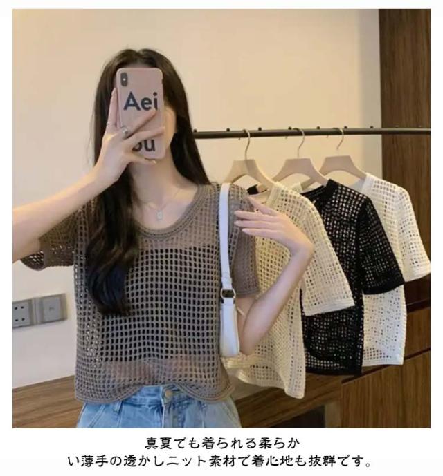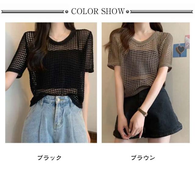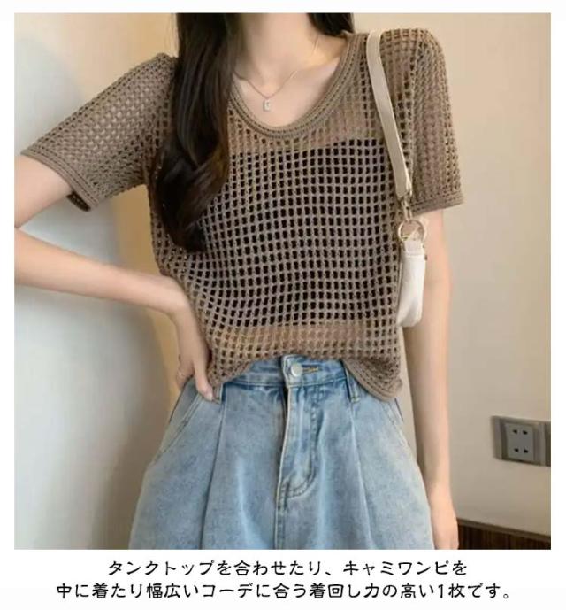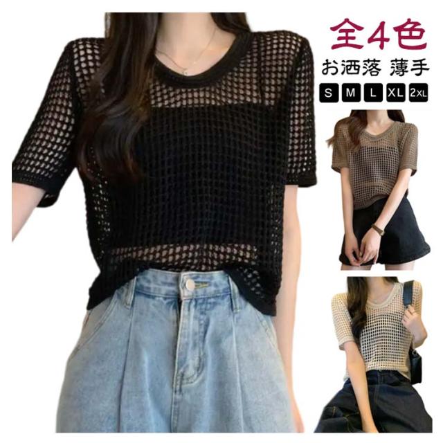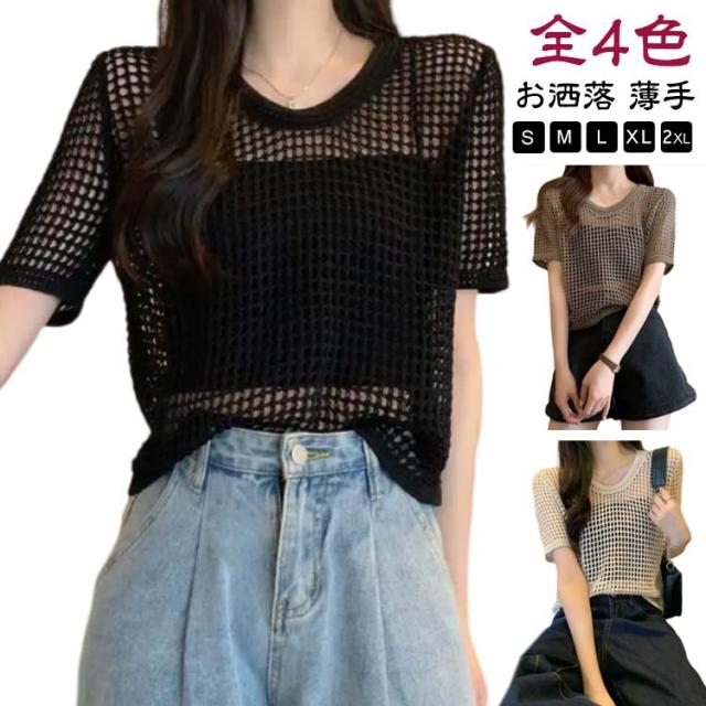 【送料無料】サマーニット レディース メッシュ ニット シアーニット 透かし編みニット 夏 半袖 トップス プルオーバー グルーネック 体型カバー 大人 お洒落 薄手 透け感 大きいサイズ 無地 着痩せ きれいめ Tシャツ 涼しい