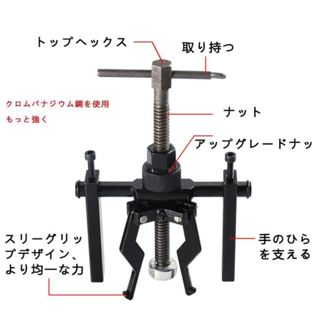 【高品質・耐久性】:このプーラーベアリングは高品質な炭素鋼とプラスチックなどの材料を作られ、高硬度、良好な靭性、強く耐久性の機能が揃っています。六角ねじで滑りにくい。爪部は増粘設計処理で耐久性が良い。